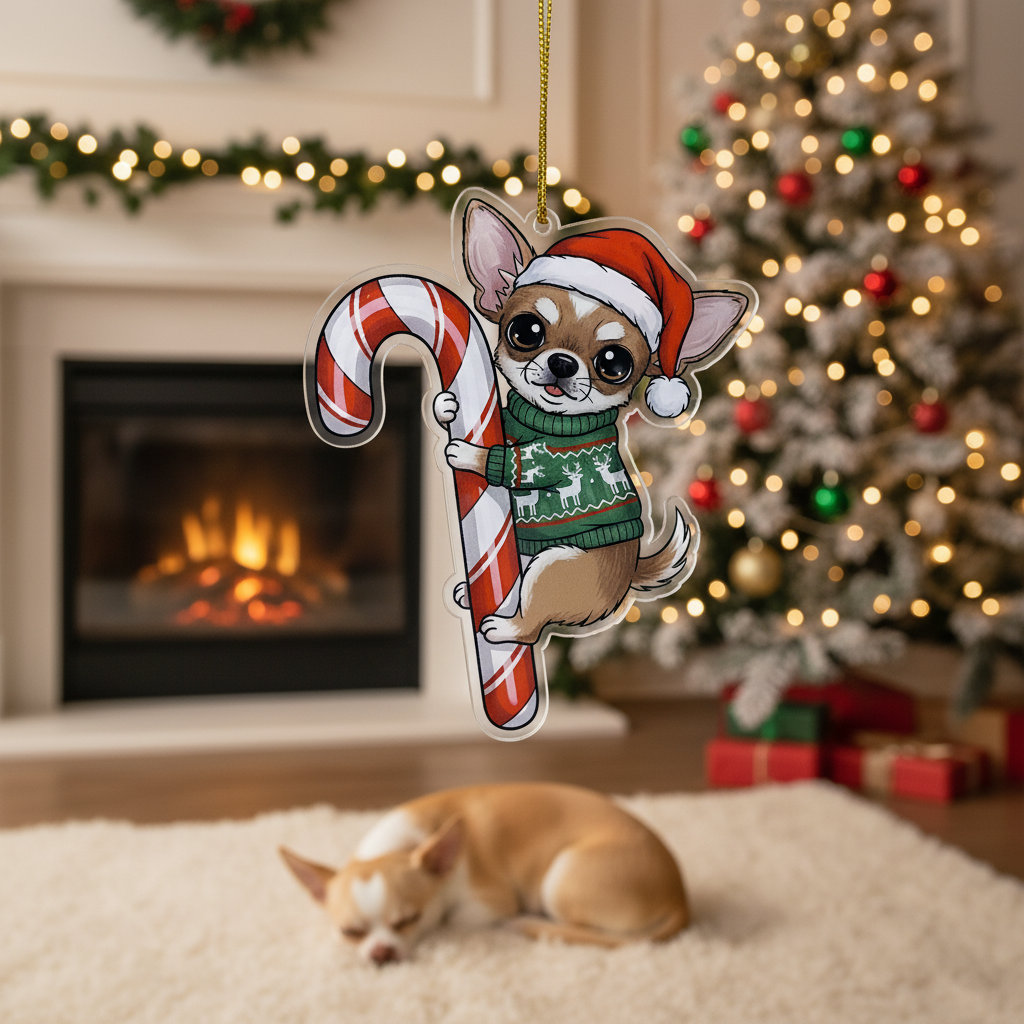 Chihuahua Hugging Candy Cane Ornament 2D Flat Acrylic Ornament - Christmas Tree Decoration, Gifts for Dog Lovers 2025