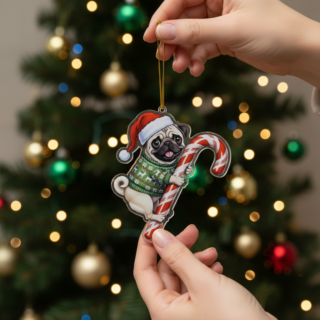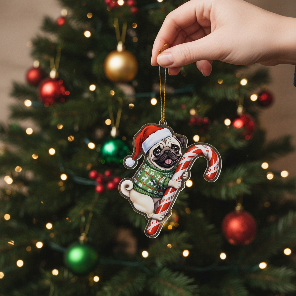 Select Options: Pug Christmas Ornament | Puggle Hugging Candy Cane Ornament 2D Flat Acrylic Ornament - Christmas Tree Decoration, Pug Gifts for Pug Lovers 2025