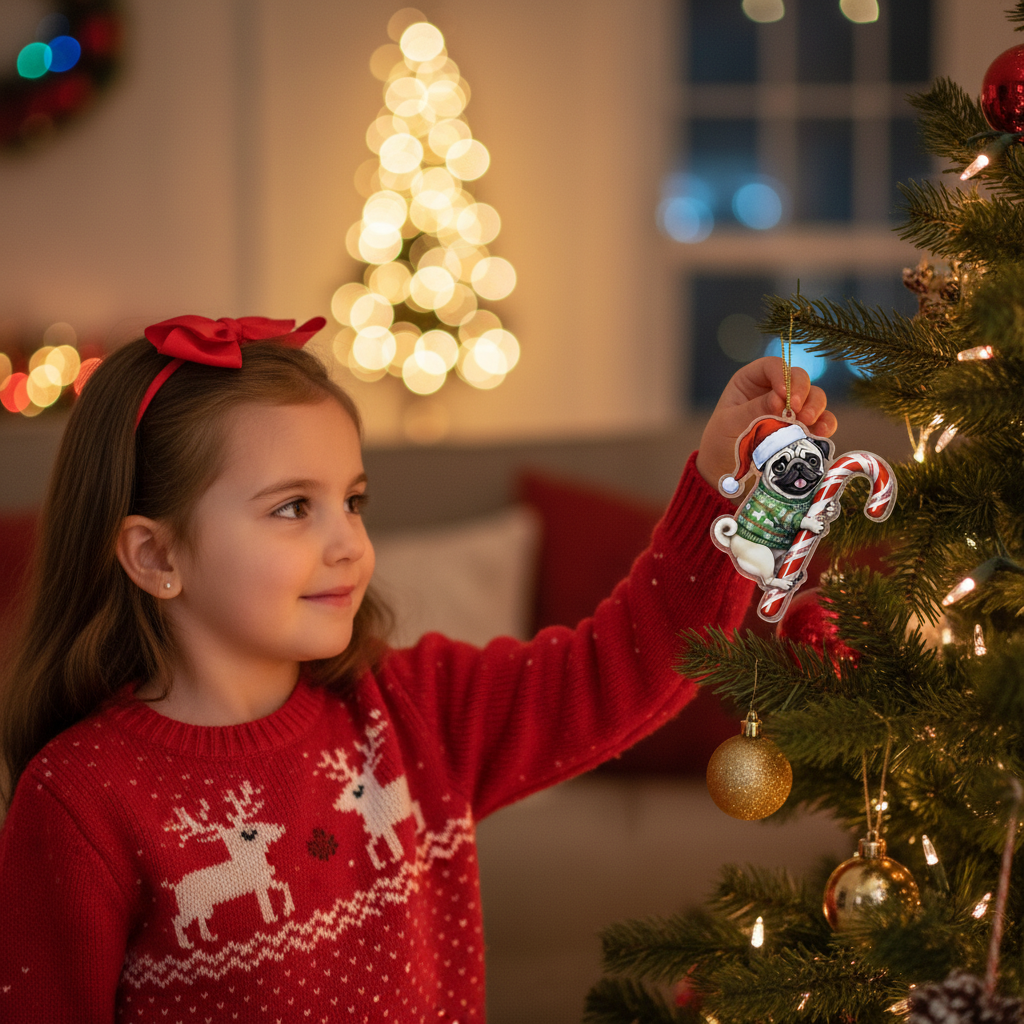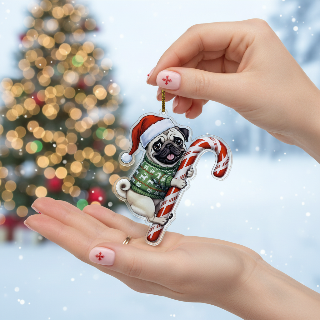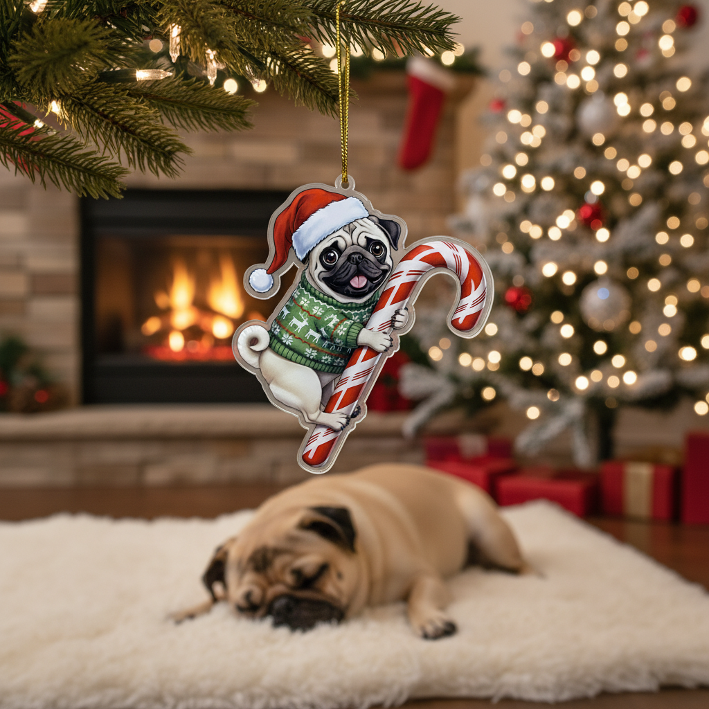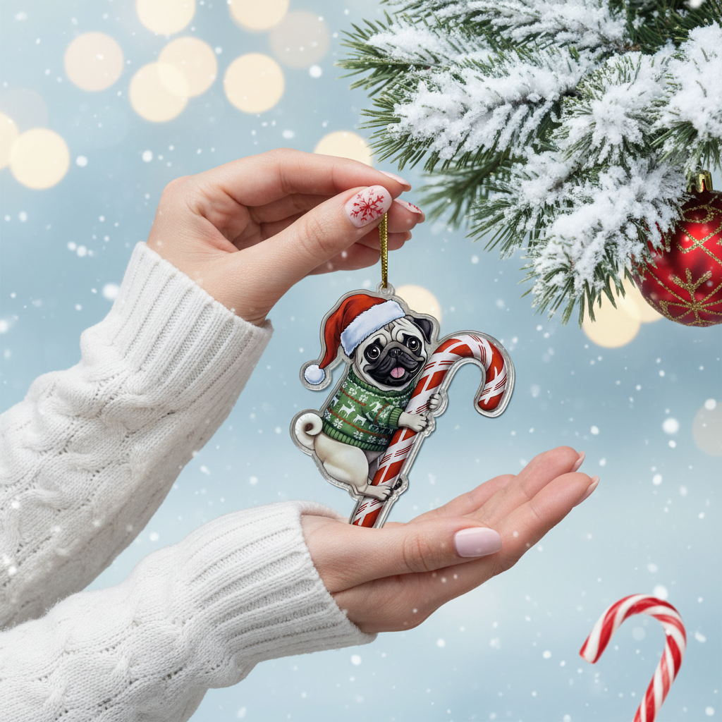 Pug Christmas Ornament | Puggle Hugging Candy Cane Ornament 2D Flat Acrylic Ornament - Christmas Tree Decoration, Pug Gifts for Pug Lovers 2025